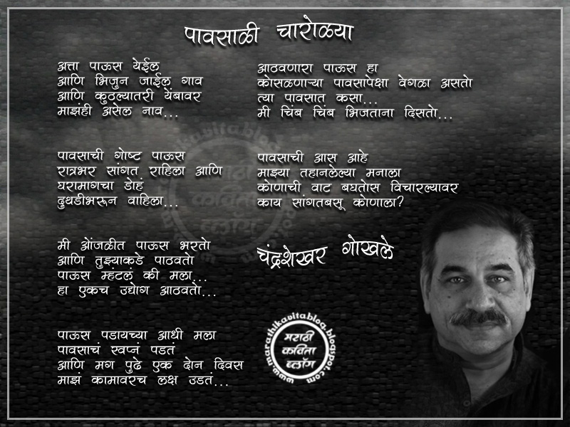 Pavsali Charolya... पावसाळी चारोळ्या ... Info Post Unknown 00:52 No Comment Pavsali Charolya... पावसाळी चारोळ्या ... Share: Facebook Twitter Google+ StumbleUpon Digg Delicious LinkedIn Reddit Technorati